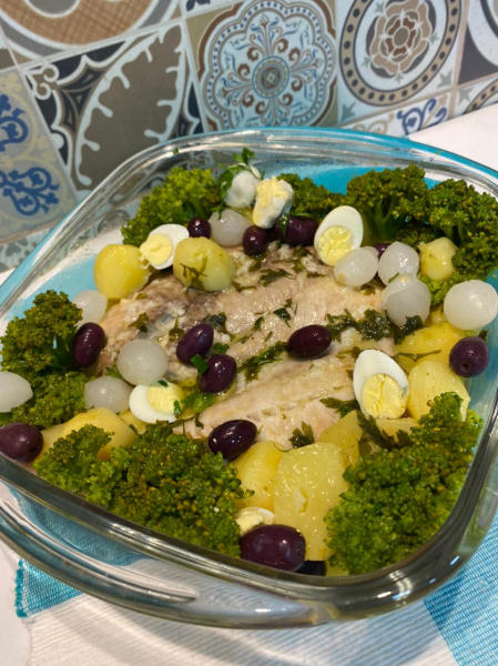 Em uma vasilha, faça camadas com tomate bem vermelhinho, cebola roxa , pimentões coloridos e batatas cozidas, todos os intens picados. Coloque o peixe por último.